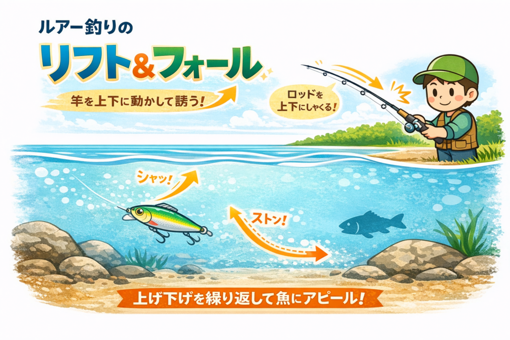 竿を上げてルアーを浮かせ、落とす動きです。