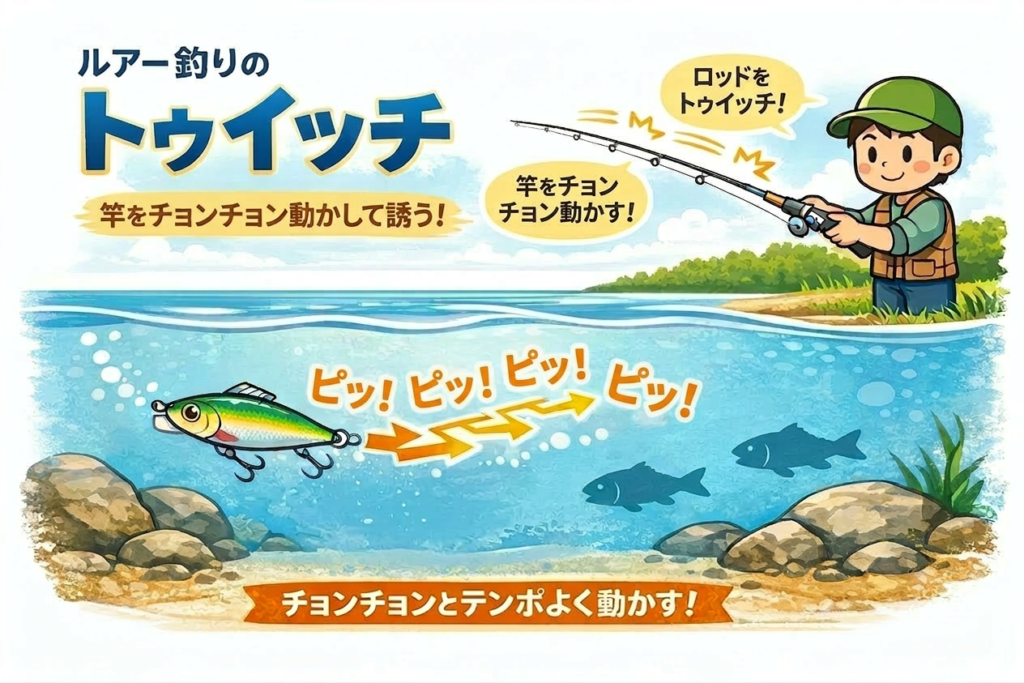 竿先を軽く動かして、ルアーを左右に動かします。